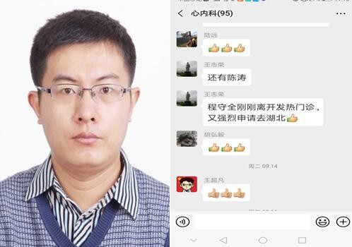 面对这场突如其来的疫情,程守全大夫毅然选择了逆向而行。在报名支援发热门诊时,程大夫说“疫情就是冲锋号,发热门诊就是主战场!”“我是一名共产党员,疫情来了,我不上谁上?”程大夫主动请缨加入发热门诊的第一梯队。坚守发热门诊时,在一天接诊100多位患者的超负荷工作下,他从未道过一声苦,为节省防护服,值班期间只吃一顿饭,只上一次厕所的程大夫,在卸下防护口罩后,脸上是深深的印痕,脱下防护服浑身上下已然全部湿透……作为一名医务工作者的他知道,自己也存在着被感染的巨大风险,但在疫情面前,他已经将个人的生死和安危置之度外。为了减少家人被感染的几率,程大夫选择了不回家,在医院进行自我隔离,身为大夫的他,同样也是父母手心里的长子,也是妻子依靠的港湾,也是孩子伟岸的父亲,同时也是一个家庭坚强的支柱!在程大夫的朋友圈有自我隔离日子的倒计时,他是在为自己打气,同时也是为家人朋友们打气。他带着无私奉献的精神,带着无悔信念舍小家而为大家的精神奔赴一线,成为最美“逆行者”,他无时无刻不在践行着“为祖国医药卫生事业的发展和人类身心健康奋斗终生”的无悔誓言。