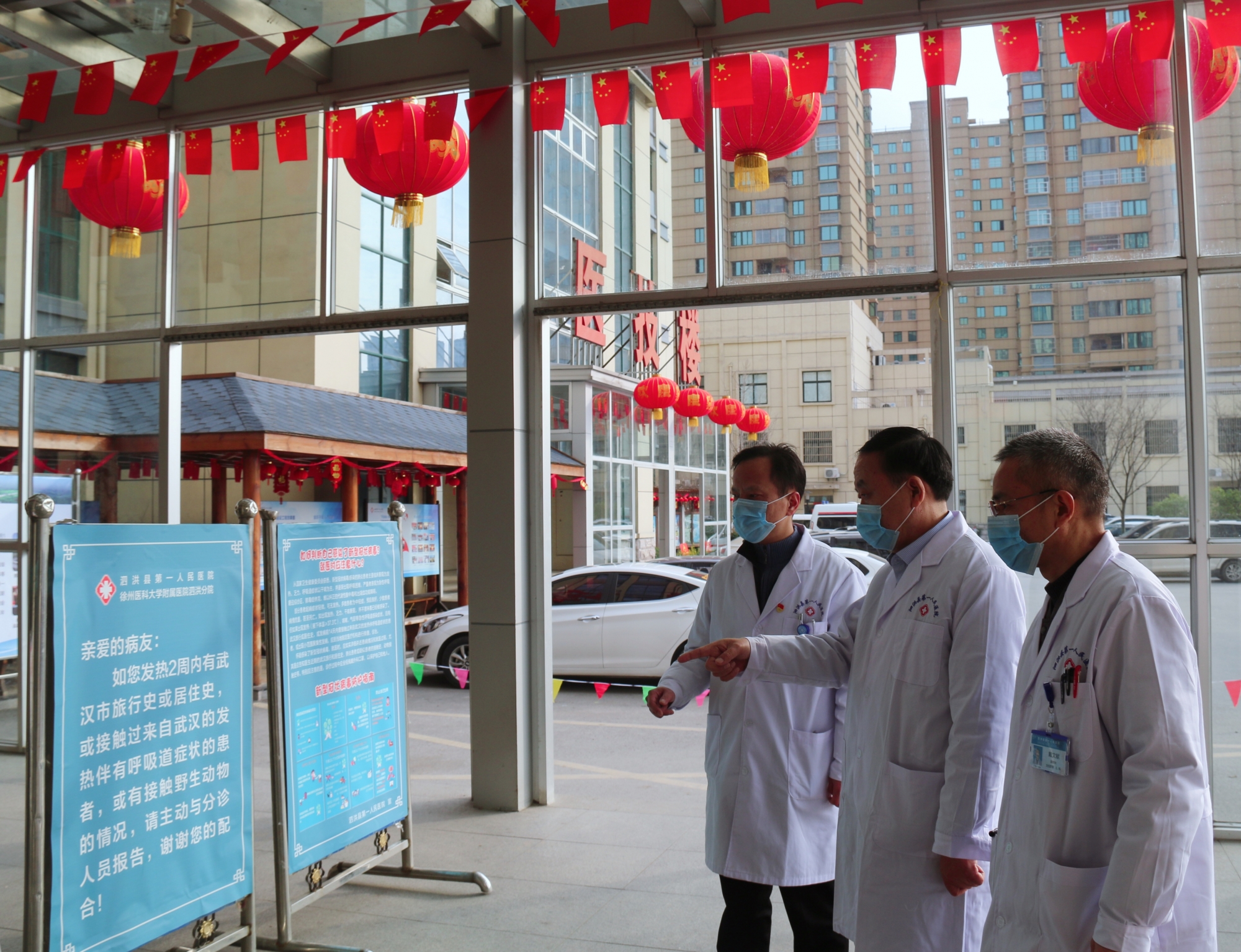 新型冠状病毒感染肺炎疫情牵动全国人民的心,徐医附院泗洪分院(泗洪县第一人民医院)是泗洪县确定的新型冠状病毒感染肺炎患者定点收治医院,1月25日(大年初一)以尹忠诚院长为首的徐医附院泗洪分院管理团队放弃春节与家人团聚的机会,奔赴泗洪抗击新型冠状病毒感染肺炎的第一线。到院后紧急召集院领导班子和相关职能部门负责人召开疫情防控工作部署会议,会上深入贯彻学习习近平总书记关于疫情防控的一系列重要指示批示精神,在当地政府统一领导、统一指挥下,对疫情防控工作再研究、再部署、再抓实,强调全院要坚决贯彻“坚定信心、同舟共济、科学防治、精准施策”的要求,以更硬措施、扎实作风、严明纪律,奋力夺取疫情防控阻击战的决定性胜利。