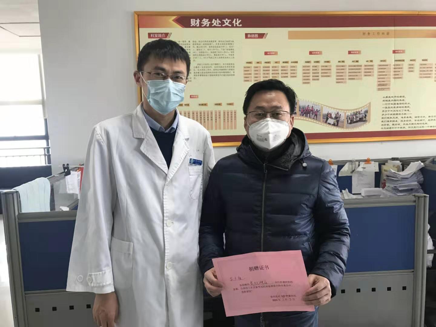 2月2日上午,热心市民吕先生夫妇向我院基金会捐助2万元现金用于新型冠状病毒感染肺炎疫情防控。知道医院防护物资紧缺的消息后,吕先生和夫人一直在积极联系国内外的渠道为医院购买防护用品,国内购买困难,又担心国外购买的产品不符合标准,所以直接向医院捐助现金。该笔资金将被收入医院基金会,作为专项支出。改革办夏琳处长和财务处毛宇辉处长代表医院接受捐赠。