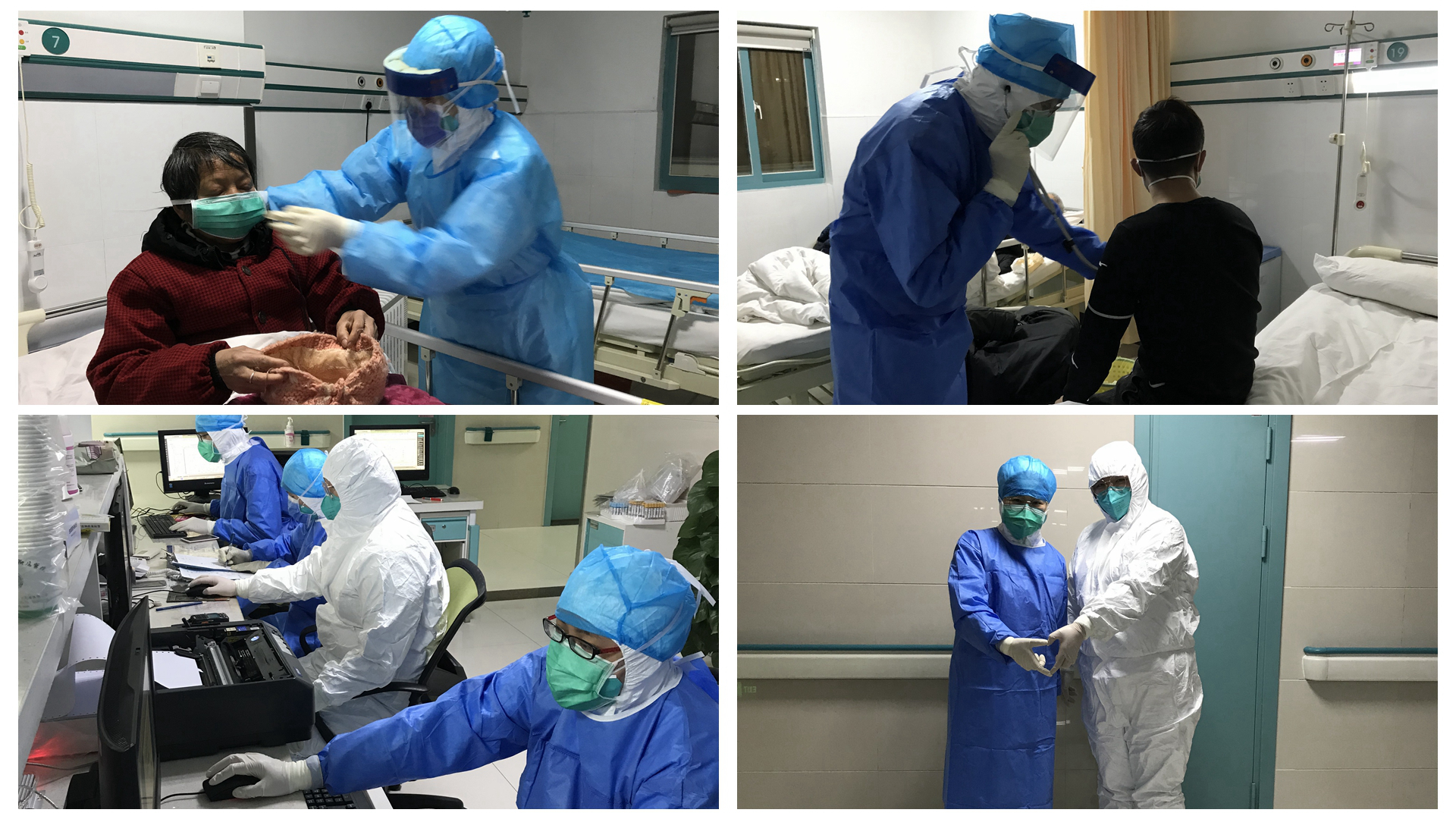 在隔离病区,他们穿着厚重的防护服,带着护目镜,因为护目镜上起雾视野模糊,水雾经常凝结成水珠沿着脸颊流下。进隔离病房前,他们都尽量少喝水,不上厕所。隔离病房里无时无刻都能看到身着防护服的身影,他们对病人询问、护理、谈话谈心……