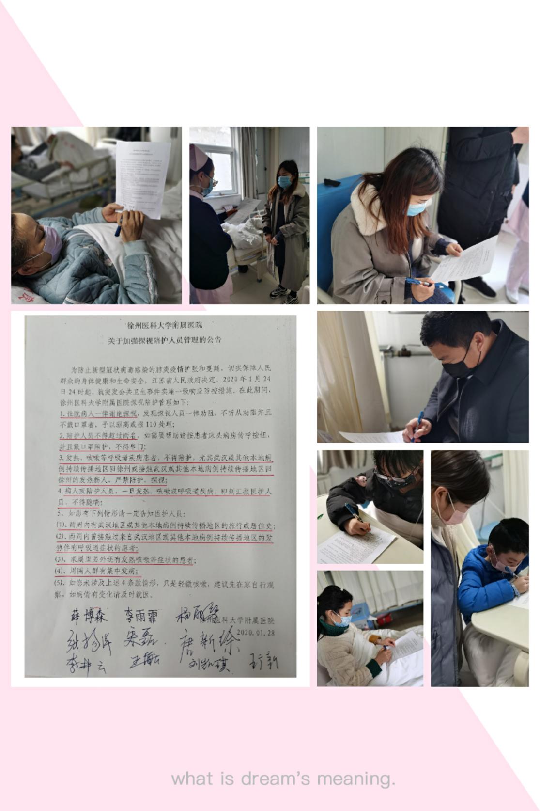 2、向患者及家属宣读徐州医科大学附属医院“关于加强探视陪护人员管理公告”,每一位患者家属听后都签字表示理解并大力支持配合,截至发稿,无一例患者及家属违约;