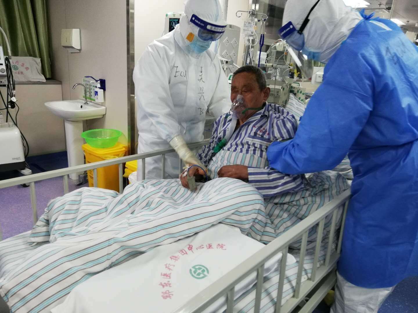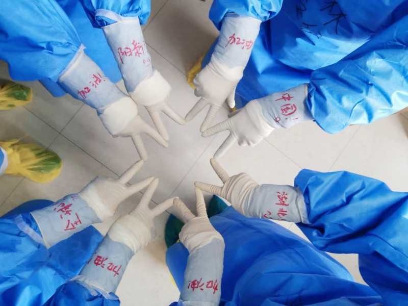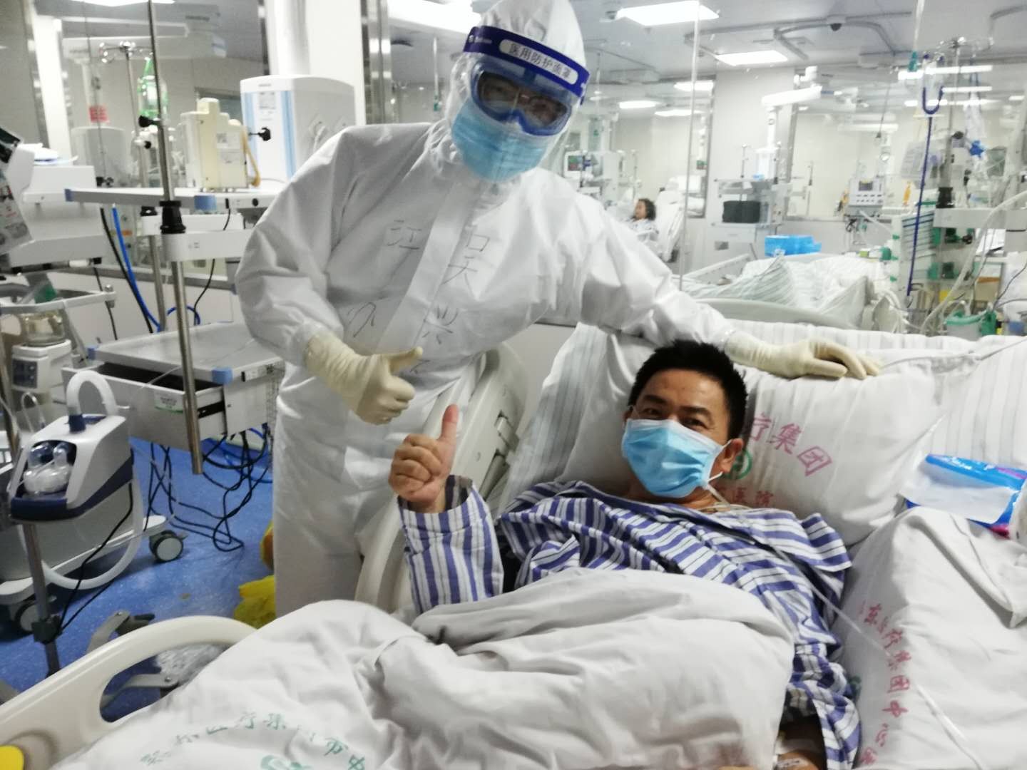犹记得15床,是位50岁大叔,也是当时监护室里最重的一位患者,脉养波动大,血压不稳,气管插管,机械通气...好在大叔意识还清楚一点,我一边无比耐心的语气安慰,一边口腔冲洗、翻身拍背、活动四肢、精确执行医嘱…经过两天的救治与护理后,CT示病灶已大部分吸收,得知此消息,大叔在白板写着“我痊愈了,可以出院了”,兴奋之情溢于言表。第二天,大叔已拔除气管插管,生命体生平稳,看到此景我倍感欣慰,竖起大拇指“一切都会好的,加油!”。身体虚弱的大叔双手合十“谢谢你们,江苏医疗队,我又有了活下去的决心”。听到这句话,再苦再累都是值得的。今天大叔已转入普通病房继续治疗,走之前还邀请我去他工作的地方——武当山去转一转呢。