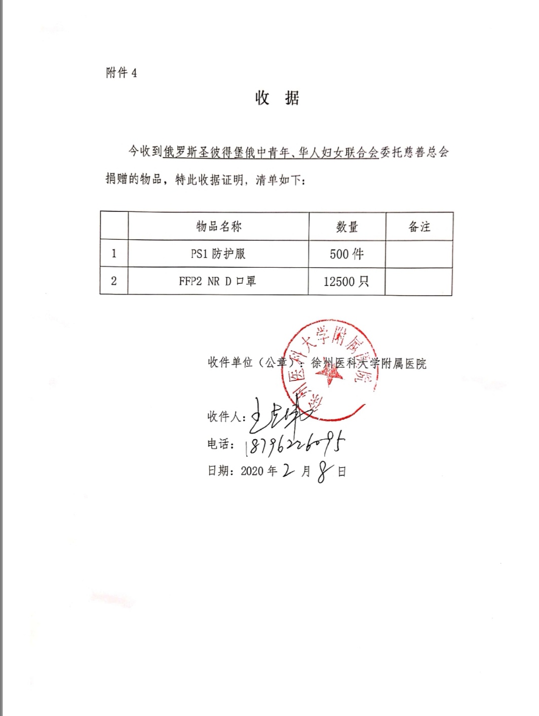 从1月28日晚上10点多联系俄方,直到2月8日历经11天,500套防护服,12500个口罩几经辗转,终于送到徐医附院,暂时缓解了医院的燃眉之急。市慈善总会领导表示:“一线医护人员是最后的生命防护线,防护物资则是临床一线医护人员的重要保障,希望这批物资能够为他们送去一份安全,只有医务人员安全了,病人的生命安全才能得到保障”。