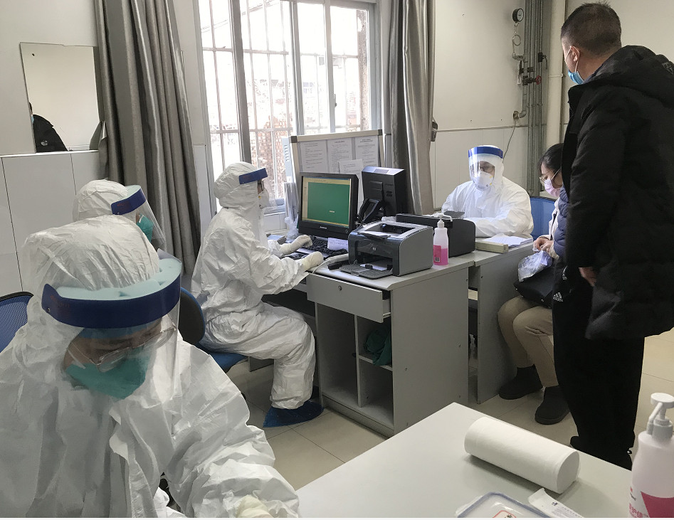 每位进入发热门诊的医务人员必须全副武装,不能暴露一点皮肤在外面,要佩戴口罩、帽子,外加护目镜和专用防护服、鞋套,这种全幅武装的装备穿在身上特难受,非常闷热,脱下衣服后,内衣基本上是湿的,而且呼吸不畅,进气出气都只能在防护口罩里进行,戴上护目镜,不一会护目镜上全是雾气,眼睛看不清,抽血时,全靠医护人员的经验。为了减少穿脱防护服的次数,上班前就不喝水,尽量减少上厕所的次数。压力之大、强度之高可想而知,但是他们毫无怨言。