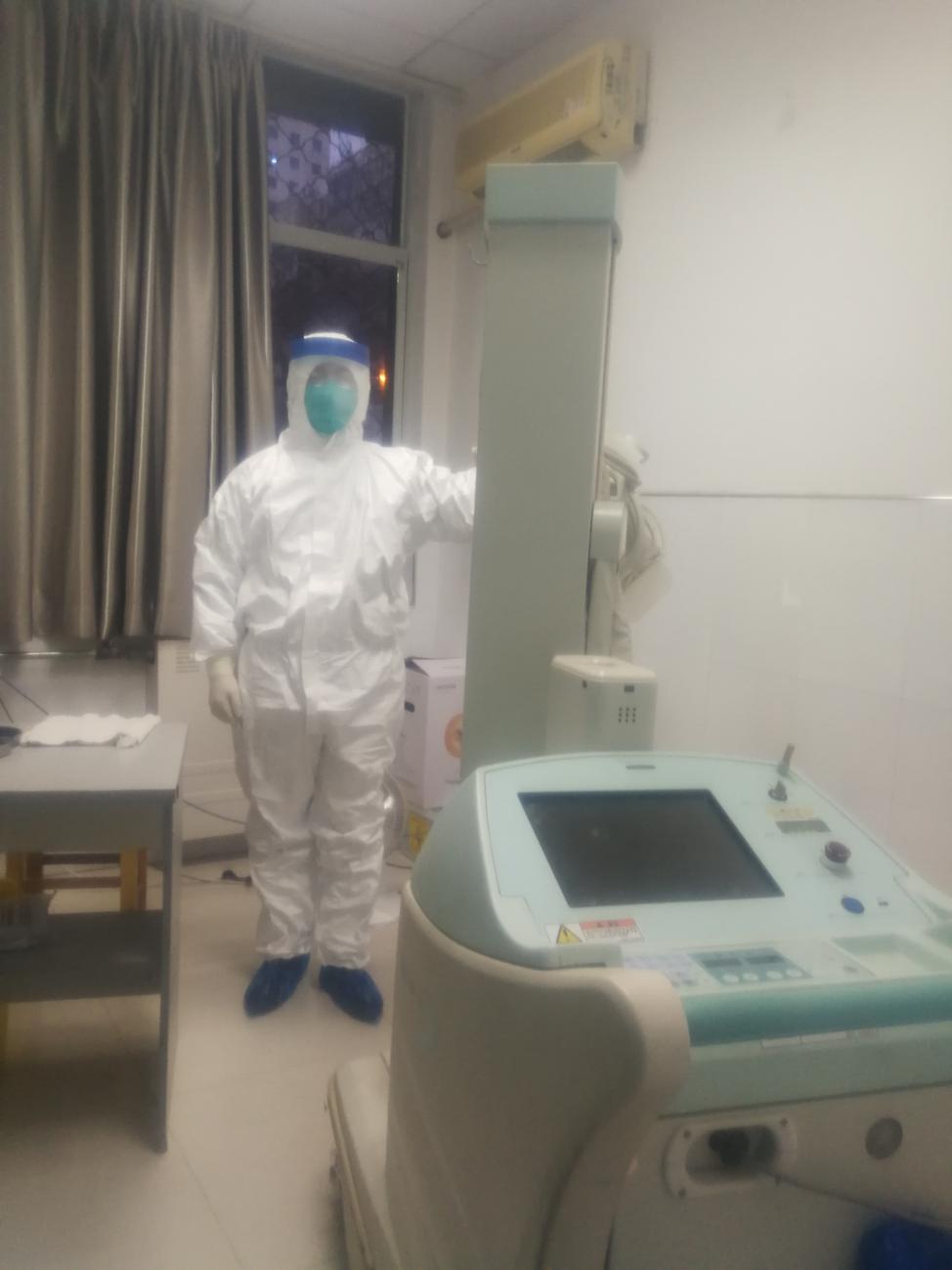 进入三区(污染区)后,立即检查摄片机状态,看电量够不够?网络通不通?检查床还没搬进来,马上看房间面积是否能放下,经过看地上瓷砖的大小确定了能放下,赶紧让一区的护士将发热门诊配置的检查床推进来,再把铅屏风也推到了摄片房间的门口,这样可以保护同志。发热门诊的内科刘医生说:“张老师你真好,昨天也没用铅屏风挡着,我们昨天忙的也顾不上躲射线了,这下好多了”。