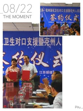 2017年8月22日,江苏省卫生计生委党组成员、中医科教处朱岷处长带领江苏省卫生计生系统领导及江苏省属八家三级甲等医院领导一行来到克州人民医院,考察江苏组团援疆工作,慰问援疆专家。江苏省卫计委与克州人民政府签订了医疗帮扶协议,徐州医科大学附属医院党委委员刘晓萍代表徐州医科大学与克州人民医院签订了“院包科”协议。