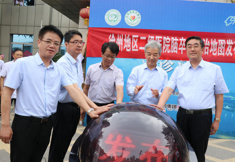 王陇德院士、巢葆华处长、书记、顾玉明院长、胡传峰主任共同启动项目球。王陇德院士和书记为地图揭幕,徐州地区二级医院卒中急救地图正式对外发布。徐州市二级医院卒中急救地图发布,是建成本地区脑卒中综合救治网络的重要基础,是提高本地区人群对脑卒中认识的重要途径,对提高区域性卒中救治水平起到关键作用。