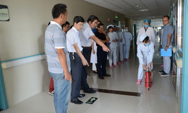 院长、书记等一行先后对病房主楼23楼办公区和电梯机房、22楼信息中心机房、15楼血液净化中心、5楼设备层、1楼配电室、-2层设备维修办公室、-3层中央空调机房,儿科医院楼1楼、2楼,教学综合楼1楼供氧中心,门诊楼1楼,巨龙3楼等地进行了拉网式的检查,主要检查了消防通道是否畅通无阻,消防栓是否有水、水压是否正常,灭火器是否齐备等,随机抽查了职工对消防安全知识的掌握程度以及消防栓、灭火器的实际操作情况,安排保卫处专业人员现场进行了规范操作演示,重点强调了以“提高检查消除火灾隐患能力、提高组织扑救初起火灾能力、提高组织人员疏散逃生能力、提高消防宣传教育培训能力”为内容的“四个能力”建设。