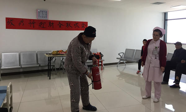 联欢会在“欢乐中国年”的音乐声中于15:00正式开始。主持人刘静娟代表放疗科护理人员给现场病人及家属拜个早年,并借此机会宣传了冬季防火防灾的常识。护士齐琪与病人一起演示灭火器使用的操作步骤。