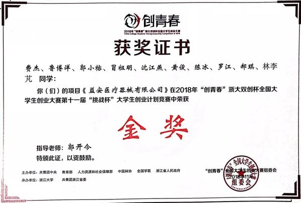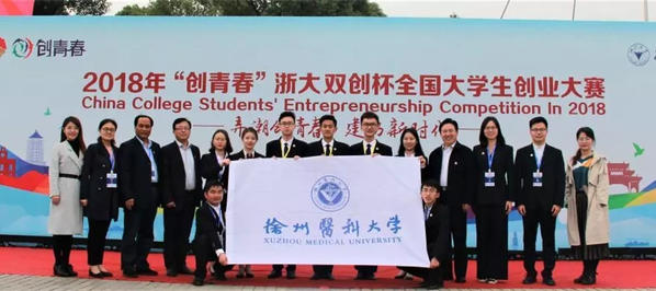 10月31日至11月3日,由共青团中央、教育部、人力资源和社会保障部、中国科协、全国学联、浙江省人民政府主办,浙江大学、共青团浙江省委承办的2018年“创青春”全国大学生创业大赛终审决赛在浙江大学紫金港校区举行。经过激烈的角逐,由徐医附院郭开今教授和徐州医科大学医学影像学院彭波书记、袁子桐老师作为指导老师的《益安医疗器械有限公司》项目斩获金奖。