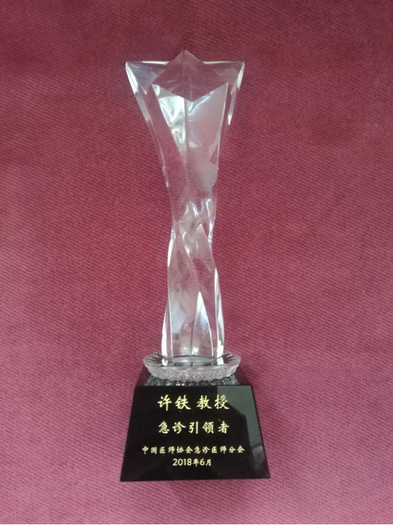在本次会议的开幕式上,颁发了专门为全国急诊医师设立的奖项,许铁教授被授予“‘急诊引领者’特殊贡献急诊医师”奖。该奖项在全国范围内遴选,限额为10名,授予为我国急诊医学事业作出突出贡献、并担任急诊科主任及以上职务至少 10 年的急诊医学的学科带头人,是经中国医师协会批准的对急诊医师的最高褒奖。中国医师协会张雁灵会长、国家卫健委医政医管局焦雅辉副局长、中国医师协会急诊医师分会于学忠会长等领导和嘉宾为获奖者颁发了奖杯和证书。颁奖词是:沉淀半生的急诊科引领者们,任岁月白头,初心不改练就大医妙手,救万千患者于危难之时。与死神赛跑是他们永恒不变的信念!