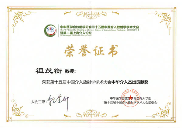 我院祖茂衡教授荣获中华介入杰出贡献人物奖