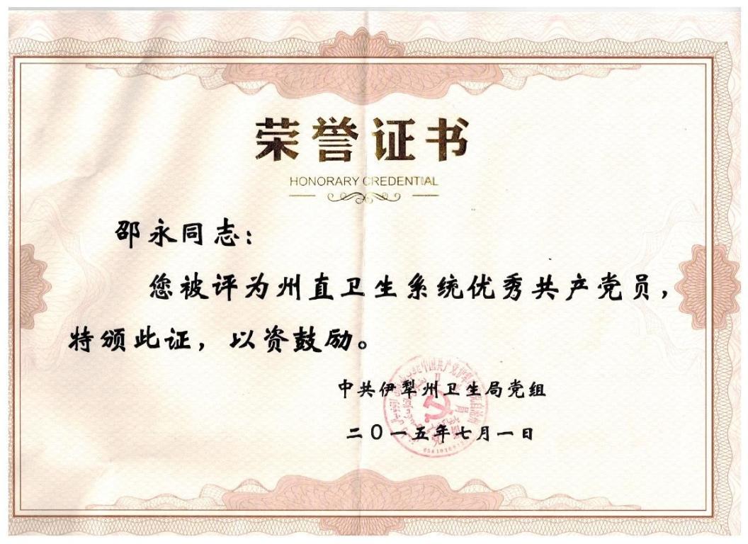 援疆专家邵永荣获伊犁州直卫生系统优秀共产党员称号