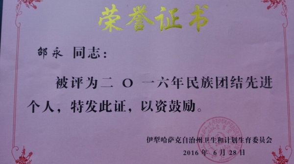 自参加援建工作以来,邵永同志牢记援疆干部光荣使命,心系奎屯医院发展,分别在技术引进、人才培养、课题研究、学科建设、学术交流、教学实习等方面取得了一定的成绩。此外,他还积极主动融入,与民族同事打成一片,充分尊重当地的生活方式,虚心学习民族文化,团结互助,真诚相待,做到不利于民族团结的话不说,不利于民族团结的事不做。在两年多的工作中,落实好民族团结,关键在“感情”字上下功夫。邵永同志是这样说的也是这样做的。自2014年8月和一对一帮扶的哈萨克族学生丹古丽结对子以来,他就一直与她保持密切联系,时刻关注她的成长和进步,时常帮助她解决学习和生活中遇到的疑惑和困难。为了让她顺利完成学业,邵永同志积极联系安排家访、探望慰问,精心组织专家专程为孩子的母亲检查身体、治疗咨询,并带去了一些生活和学习用品。