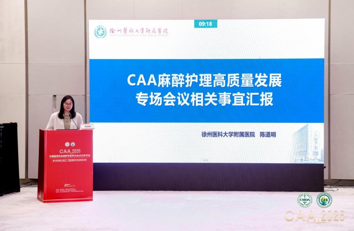 2026年4月9日至12日,中国医师协会麻醉学医师分会2026年年会(CAA2026)在杭州召开。徐州医科大学附属医院副院长王志萍当选中国医师协会麻醉学医师分会麻醉护理专业委员会组长,并在医护协同高质量发展麻醉护理专场作专题报告,充分彰显我院在麻醉护理领域的学科实力与行业影响力。